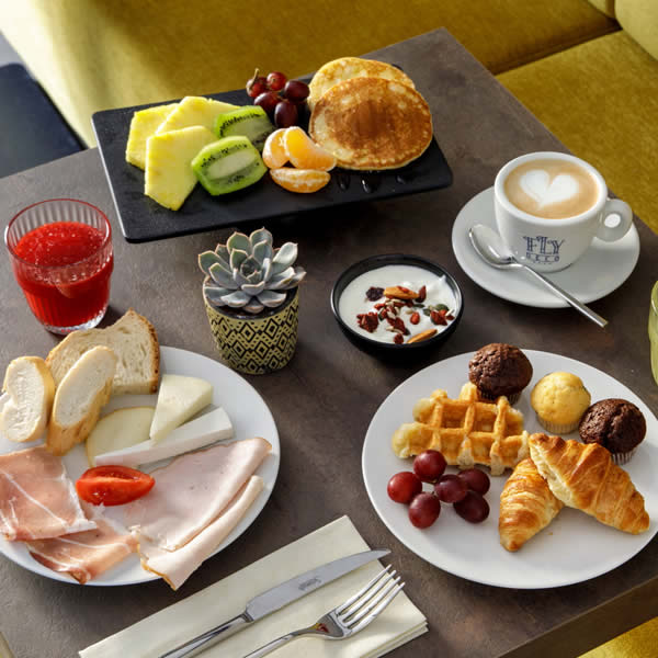 Ogni mattina gli ospiti possono iniziare la giornata nella sala colazione comune, dove viene servita una ricca colazione con proposte dolci e salate.